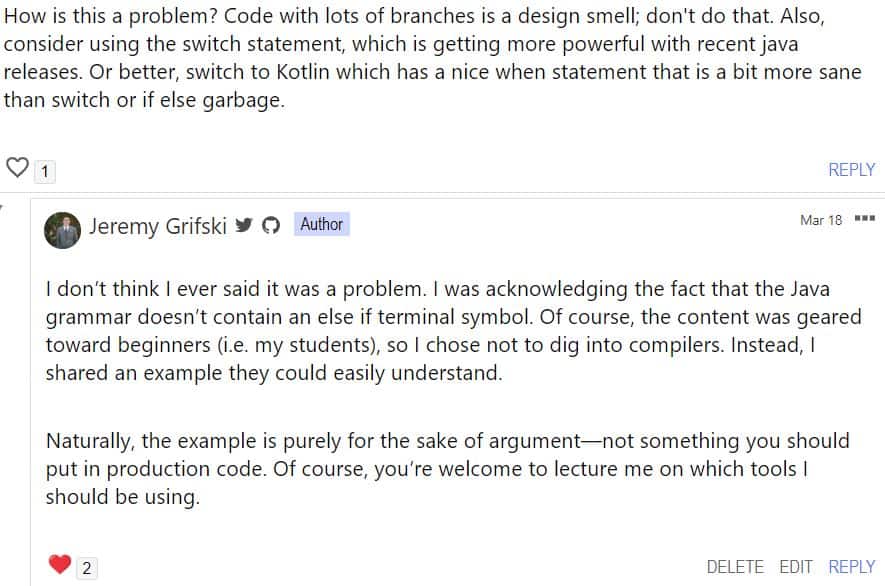 I don’t think I ever said it was a problem. I was acknowledging the fact that the Java grammar doesn’t contain an else if terminal symbol. Of course, the content was geared toward beginners (i.e. my students), so I chose not to dig into compilers. Instead, I shared an example they could easily understand.