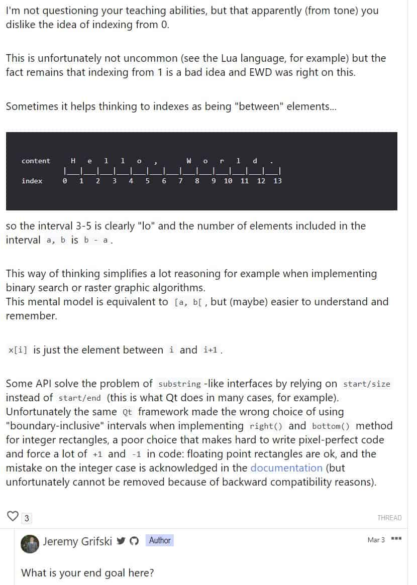 To me, this was one of the weirdest responses I’ve ever gotten. After all, not only was this person arguing against a strawman (i.e. I never once said I didn’t like indexing by 0), he also felt the need to “educate” me on something I clearly already understood. It was so very weird.