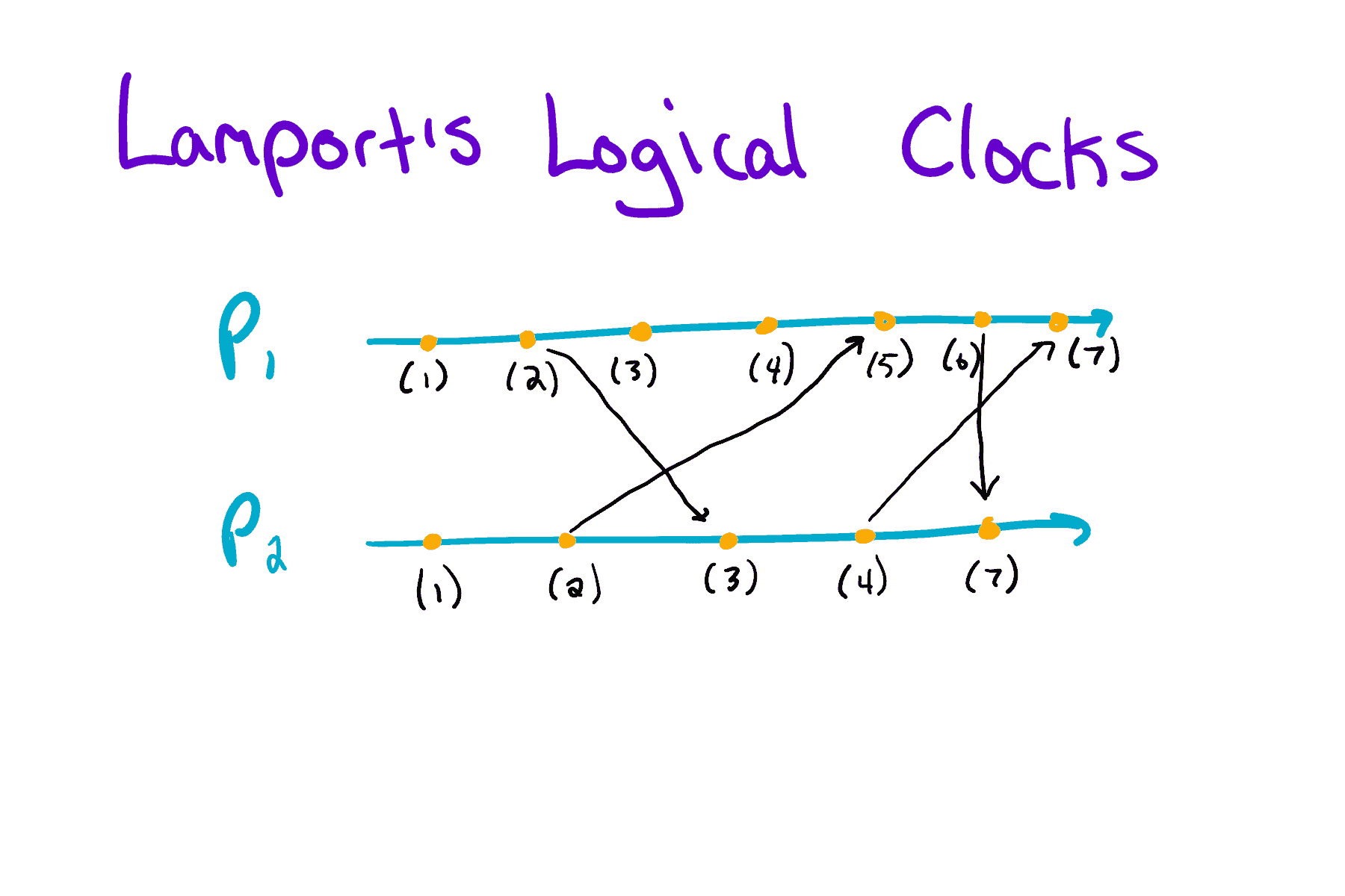 In this diagram, we have two processes: P1 and P2. As each process has an event, it increments its own clock. When a process sends a message, it attaches the current timestamp to the message. As a result, the receiving process has to determine if its timestamp is larger than the incoming timestamp. If it is, the process increments its timestamp and moves on. Otherwise, it increments the incoming timestamp and moves on.